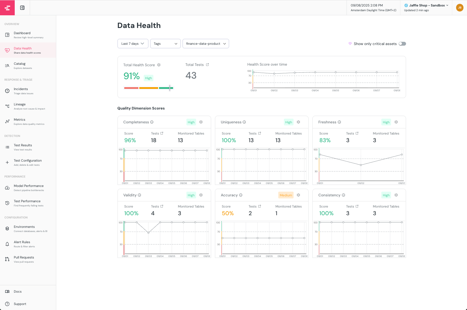 - Tests will show any of our consumers that the data is tested and healthy. For example, you can share the data health dashboard for a particular data product: