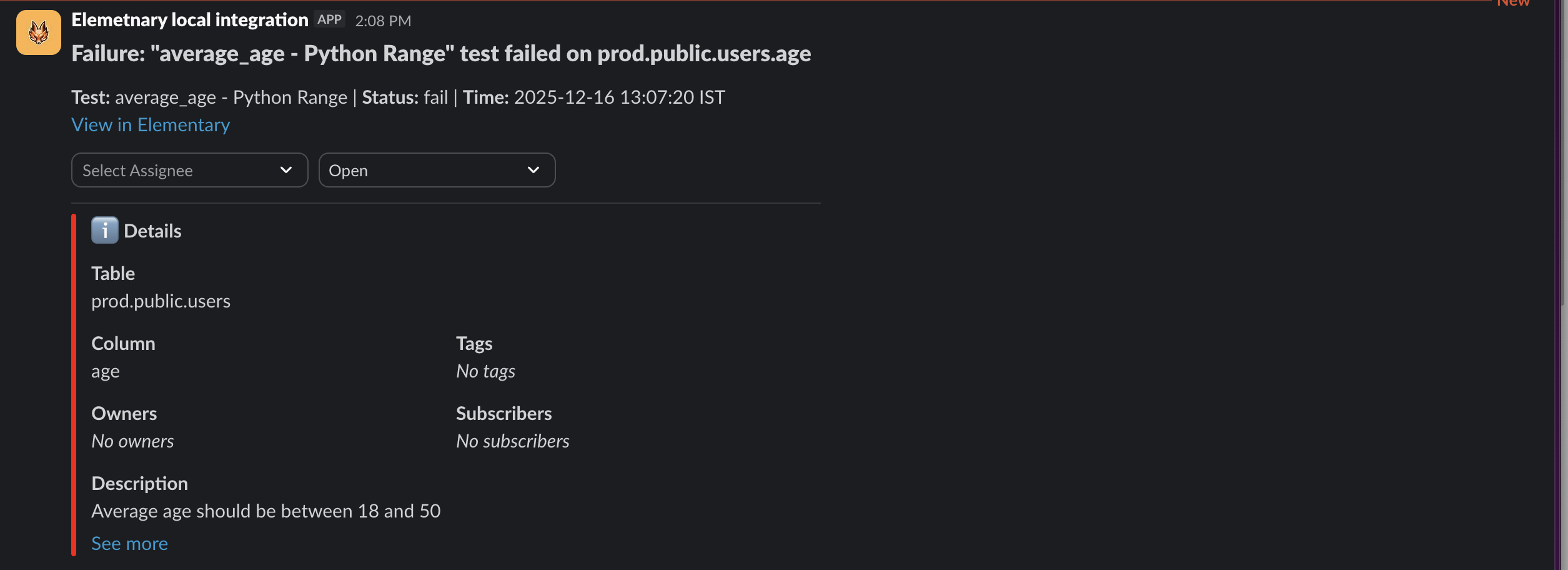 This example shows how to define and run Python data quality tests on a sample DataFrame, attach them to an Elementary asset, and automatically send the test results to Elementary Cloud.
