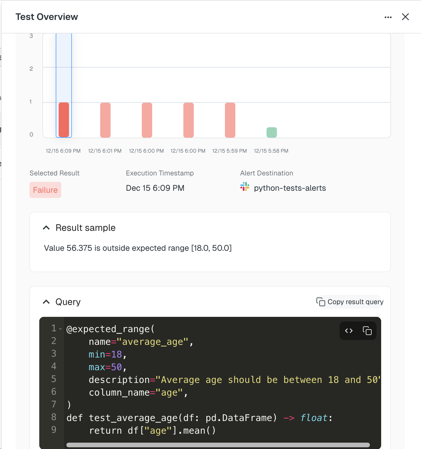 All test results appear together - Python validations, dbt tests, cloud tests, all in a single, consistent interface.
