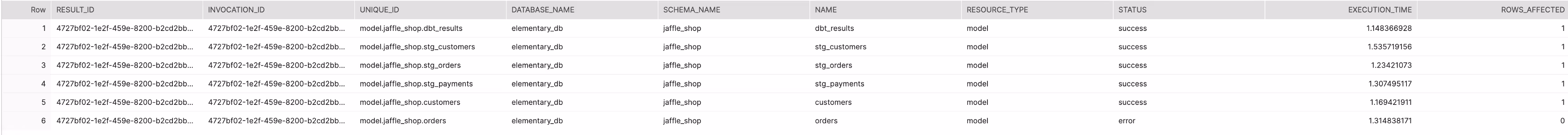 To upload these results to an incremental table we will also need to have a unique identifier for each result object. Unfortunately, currently there is no built-in unique id inside a result object. In order to handle this, we created a result_id by concatenating the invocation_id (the same for all nodes in an invocation) and the node unique_id (different for each node).