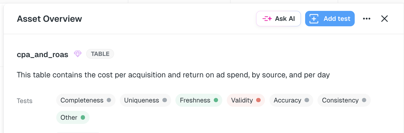 Assets now display dimension chips, showing test coverage per dimension and highlighting any dimensions with open issues.