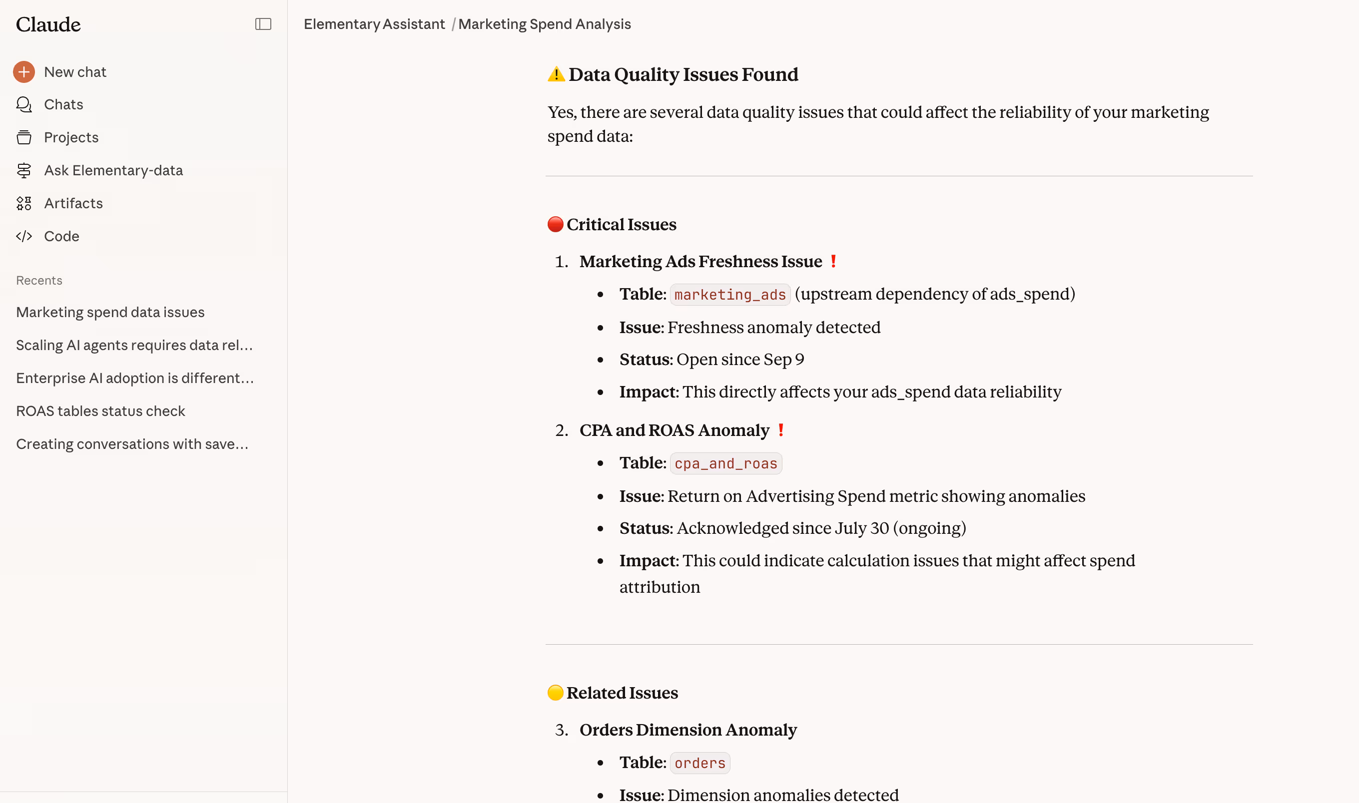 Because Elementary understands upstream and downstream relationships, impact is contextual. Analysts can see whether an issue affects the data they are using before they act.
